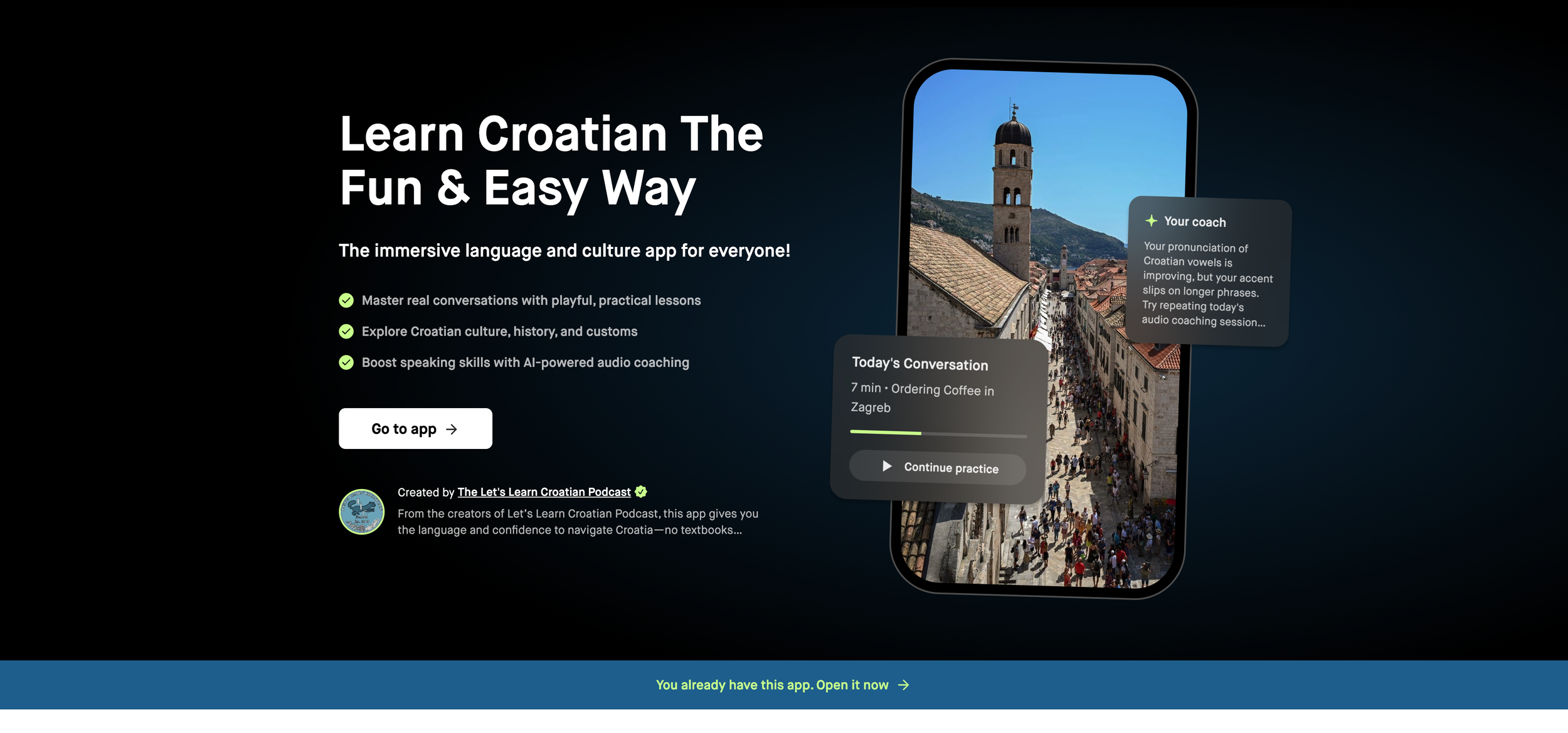 Learn Croatian through immersive real-world scenarios that make the language stick. With 24/7 AI coaching, you can practice speaking and pronunciation anytime, at your own pace. The app adapts to you, delivering a fully personalized learning experience. Add in cultural context and practical dialogue, and you’re ready for the real world.